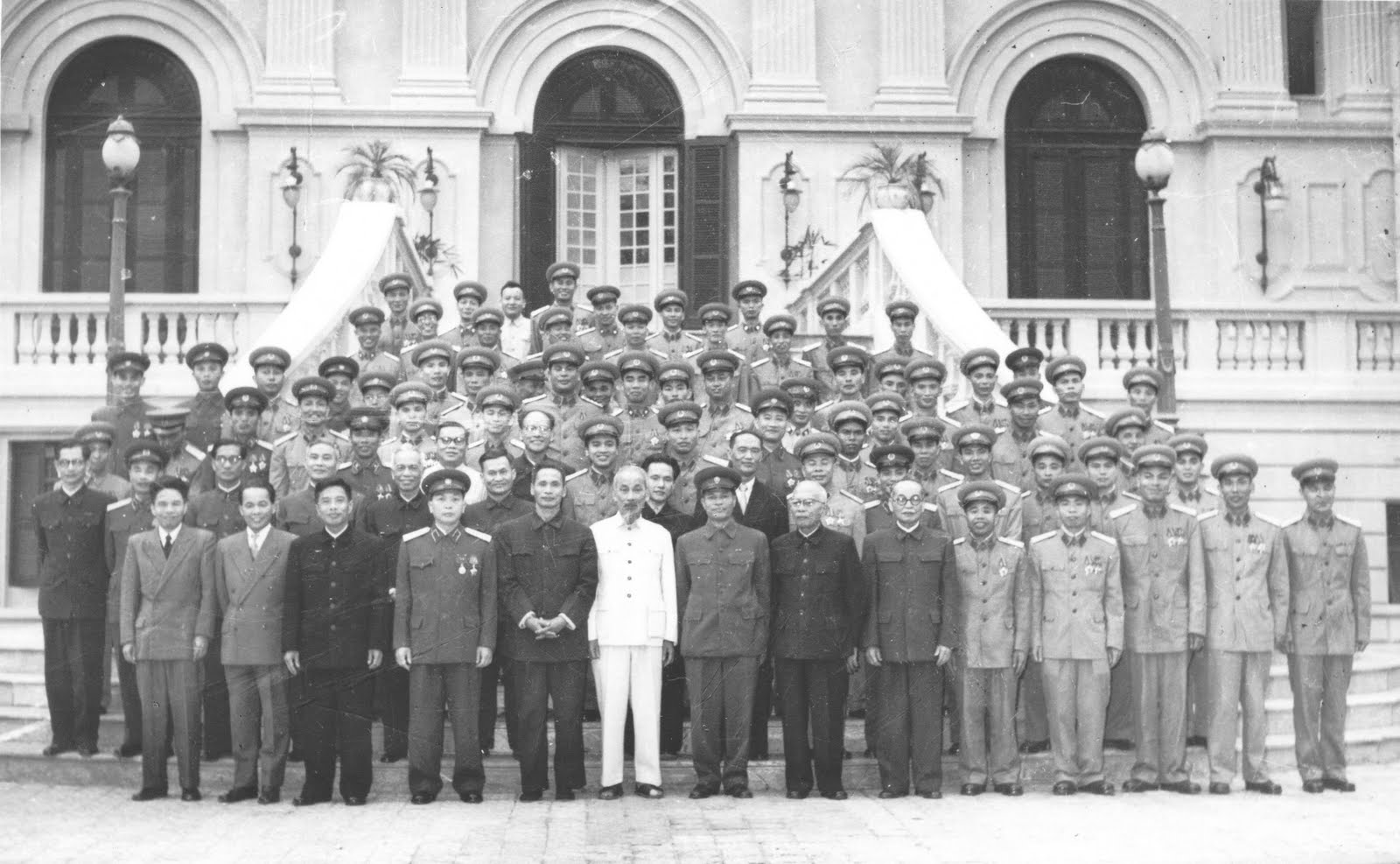 Anh TV ơi. Mới về HN thì có ông PT.Tuệ được phong tướng một mình một sắc lệnh năm 1955 để làm việc với Ban Kiểm soát Quốc tế về thi hành Hiệp định Giơ ne vơ. Còn đến 1959 mới có đợt phong các ông HM.Thảo, Lê Chưởng,... Mà trong hình này thì các ông ấy là tướng rồi, chắc chắn phải từ 1959 giở đi chứ.